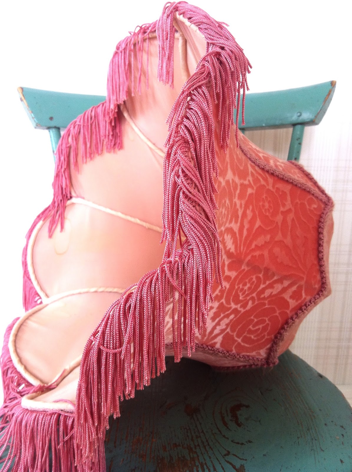 Och så hittade jag en ny lampskärm igår på loppis. Finaste fina. Egentligen hittade jag den för flera veckor sedan, men lät av någon anledning den ligga kvar. Och så grämde jag mig när jag kom hem och tänkte att det kan ha varit finaste lampskärmen i världen. Tänka sig att den låg kvar där igår. 25 :- och så fick den flytta hem till mig. Och medan jag bestämmer var jag ska ha den får den ligga på farfars lilla pinnstol bara för att färgerna är så himmelens snygga ihop. Tror förresten när jag tänker på det att jag måste göra ett inlägg snart om mina bästa färgkombos.