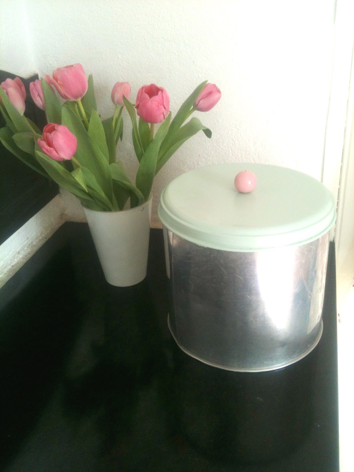 Jag snabbpysslade lite också. Min pappa hittade för ett tag sedan en sliten plåtburk hemma hos farmor. Den skulle till soptippen men så kom han på att han har en dotter som älskar skräp. Så klart jag ville ha den! Glömde ta en förebild, men locket var i alla fall väldigt slitet med lite gul avskavd färg. Använde samma färg som till konservburken. Sedan spraymålade jag en träkula och limmade på som en liten knopp på locket. Snabbfixat och burken blir finfin att fylla med nybakta bullar eller något.