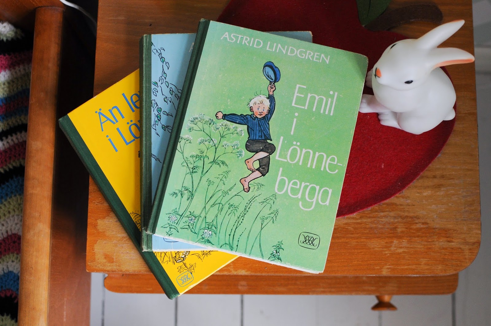 Jag håller alltid ögonen öppna efter roliga barnböcker på loppisar, särskilt Astrid Lindgrens böcker. Gissa glädjen när jag häromdagen släpat med mig båda ungarna till Erikshjälpen och där hittar alla tre böckerna om Emil i Lönneberga. Förstautgåvor hela högen. För fyndpris! Pirr i magen-fynd. Och värt att alldeles svettig jaga en köpgalen tvååring på ett knökat Erikshjälpen för.
