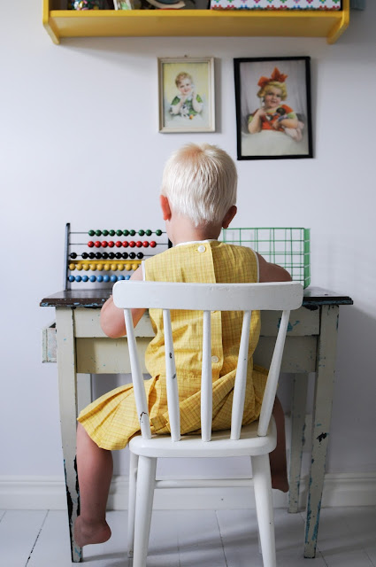 Precis rätt storlek för Edith som trots det konsekvent vägrat att ens ta i den. Så den har hängt på sin galje till beundran i vårt sovrum. Men idag deklarerade Sixten att DEN skulle han ha. Såklart. Alldeles lagom åt honom nu, och maken till söt har jag nog inte sett. Han spatserade runt i barnrummet och smälte in alldeles perfekt bland alla gamla barngrejer vi samlat på oss.