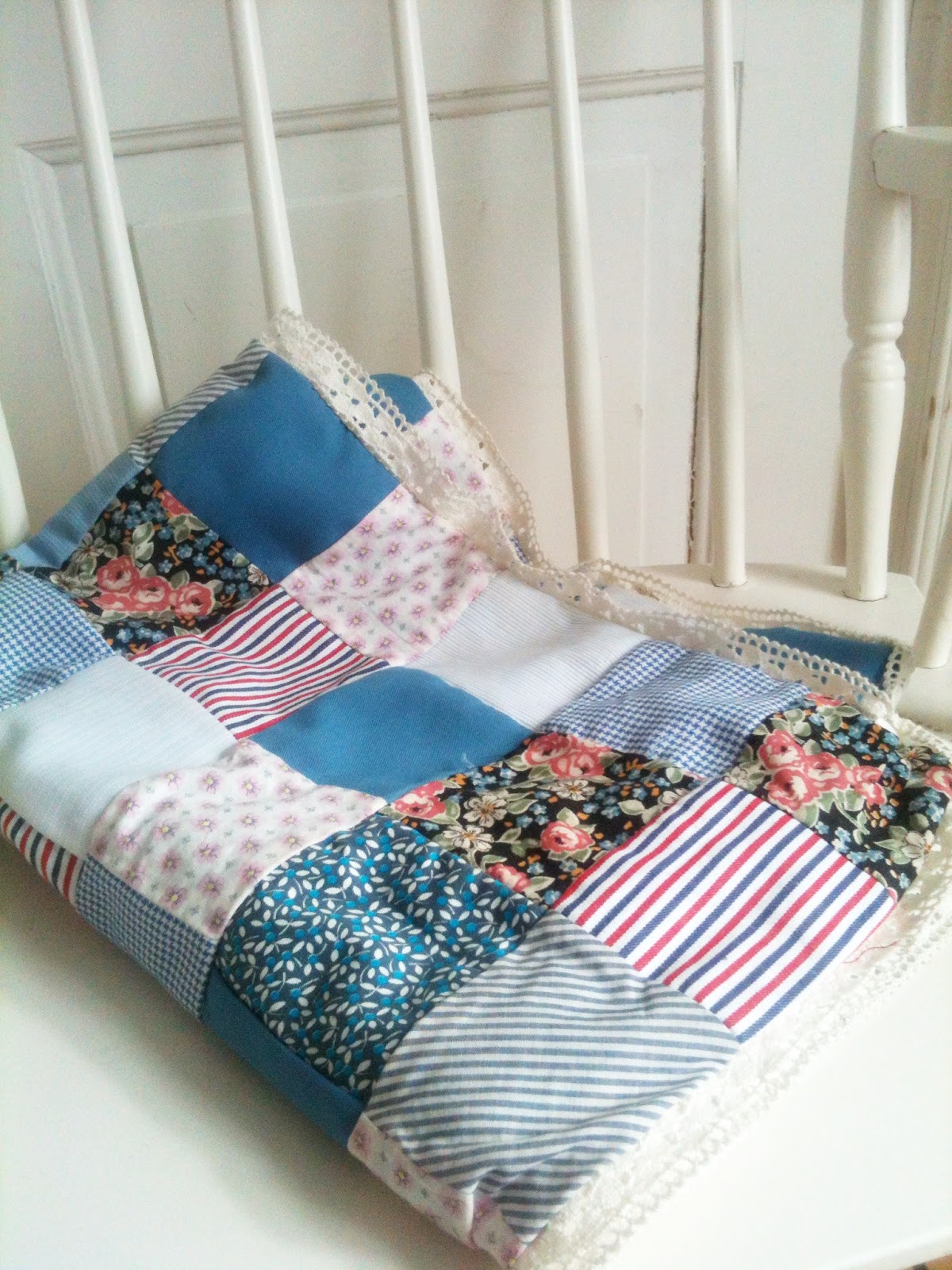 Innan Sixten föddes för tre månader sedan sydde jag ett litet lapptäcke av gamla stuvbitar jag fått av mormor till honom. Att sy lapptäcke är bland det enklaste man kan göra om man bara har lite tålamod. Perfekt om man inte är jättevan vid att sy eftersom man inte behöver göra några synliga sömmar. Också perfekt när man har småbarn och bara minilite pysseltid åt gången. Då kan man sy ett par rutor åt gången liksom.