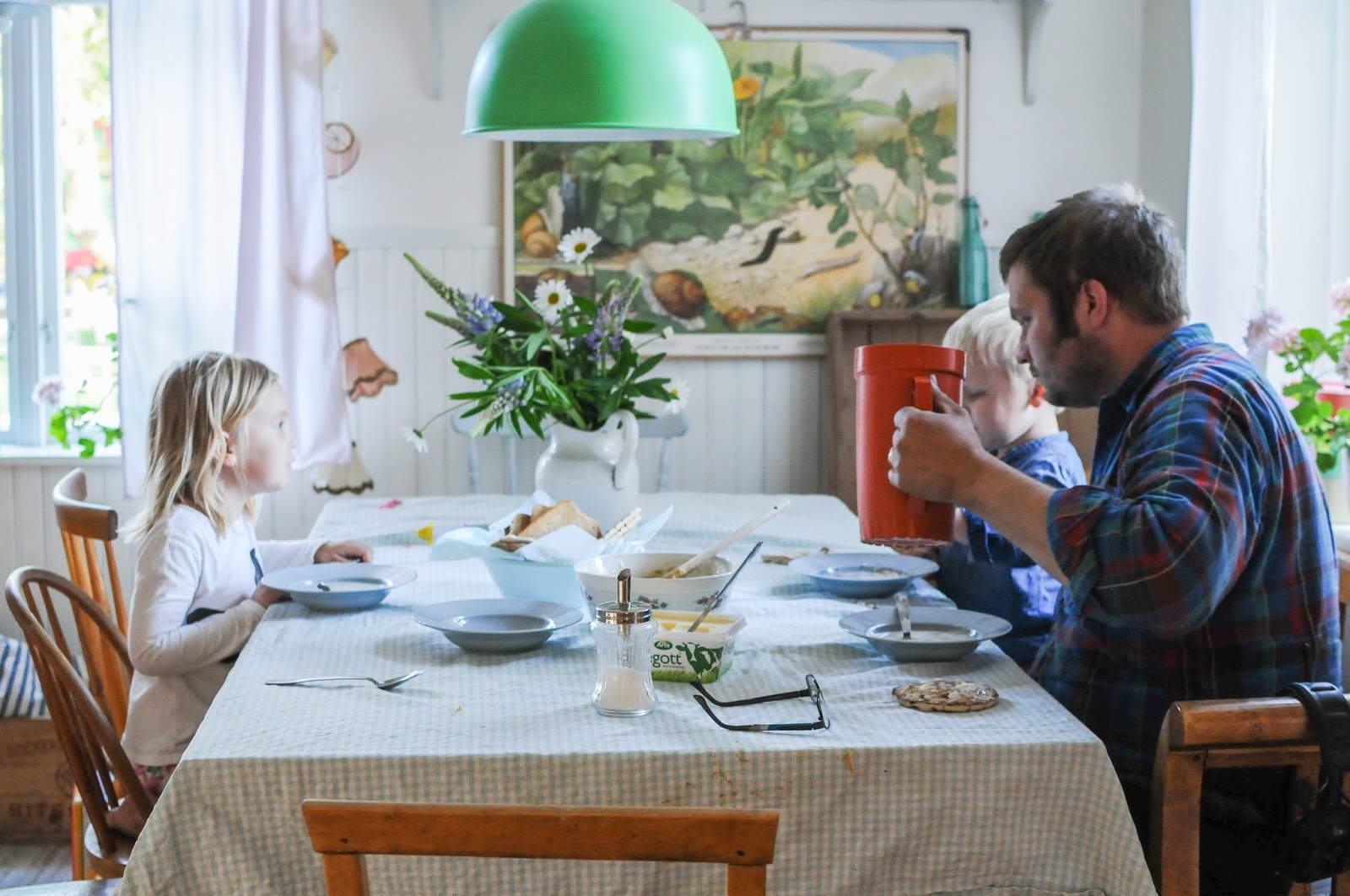 Helgen bjöd på blandade skördar kan man säga. Gräset håller Jonas på och skördar för fullt, men jag har mest skördat loppis- och bodsfynd. I fredags kilade jag och barnen ner till vår granne som ska flytta och hade lite loppis. Hem kom jag med en fin sockerlåda, ett tjockt fint bomullstyg som nog ska få bli överdrag till kökssoffan och en kanna som gjorde sig ypperligt bra som vas.
