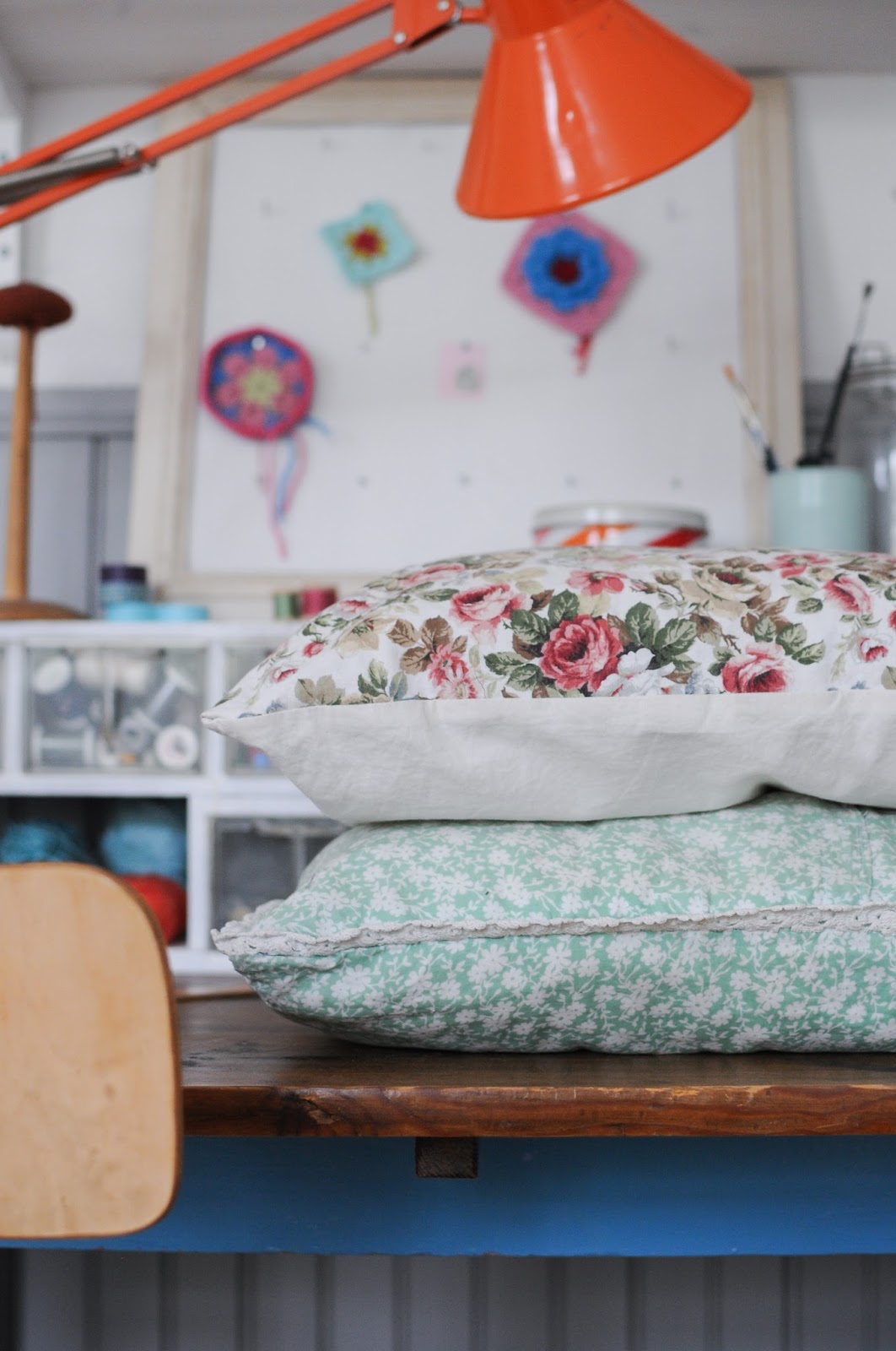 Till framsidan behövs en större del och en mindre, men båda så stora att kanterna som ska bli vid öppningen båda går att fållas och ändå ligga några centimeter omlott. Jag börjar med att fålla kanterna på framstyckena som ska sitta omlott, och sedan styr jag ihop dem som jag försökt visa på bilden här ovan. En fyrkant där uppe, och en nere. A och B är ju alltså då de båda framstyckena. När det är gjort är finns ju liksom bara ett framstycke och ett bakstycke, så då tar jag helt enkelt och lägger dem rätsida mot rätsida och syr ihop alla sidor. Sedan vränger jag alltihop åt rätt håll genom öppningen, gör knapphål och syr i knappar. Eller ibland knytband istället för knappar. Vill man ha en spets eller något band runtom kudden lägger man den bara emellan bak- och framtycke innan delarna sys ihop (och ser till att man syr igenom alla tre lager).