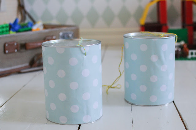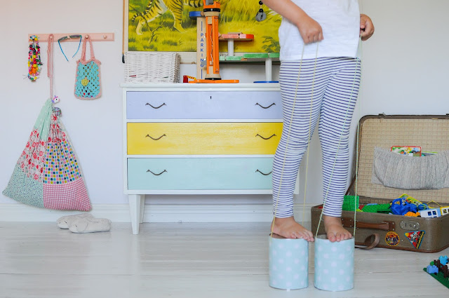 Som ni vet vid det här laget tycker jag allra bäst om att pyssla med sådant som råkar finnas hemma. Just nu har vi överflöd av plåtburkar modell större eftersom Brittas ersättning kommer i dem. Mer än en burk i veckan har det gått åt sedan hon var en månad, så hej vad vi har pysslat med burkar. Jag har ju redan visat amplarna jag gjorde i våras, och här kommer pyssel nummer två; styltor!