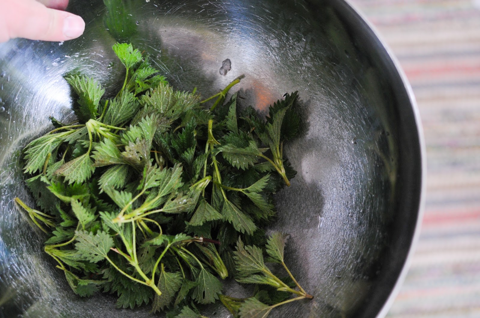 Men sedan kunde jag skörda en hel massa fina spenatblad. Planen var att göra en paj, och för att dryga ut spenaten borstade jag bort snön i ett hörn av trädgården och plockade en massa fina späda nässelskott.
