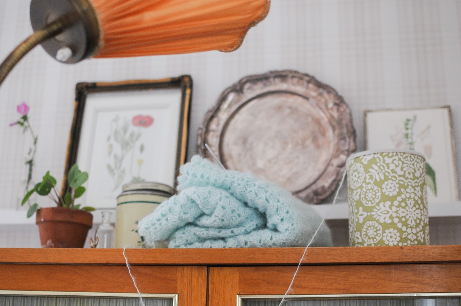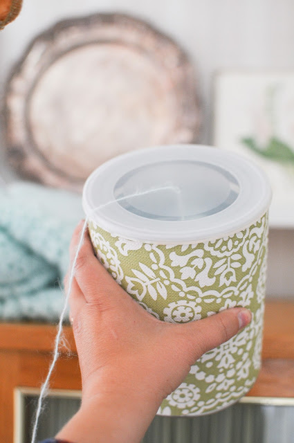 Klädde min burk i en gammal tapet som passar i vardagsrummet där virkningen oftast ligger. Smart och snyggt!