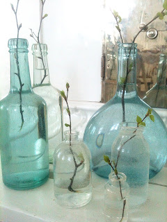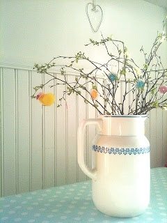 Det är som att jag kom av mig helt med påskpyntandet i år, som att jag inte riktigt fattat att det skulle bli påsk nu när våren inte kommit än. Men lite det är det som är så skönt med påsken! Den känns så kravlös på något sätt jämfört med julen. Vi bara slappar här hemma. Leker lite, äter lite gott, träffar våra familjer lite som vi känner för det. Påskriset fick vi ju fram för ett tag sedan, och några påskliljor har jag införskaffat. Sen fick det räcka med påskpynt. Sen har jag vårfixat lite när jag känt för det. Lite björkkvistar i blå och genomskinliga glasflaskor är det finaste. Så enkelt och vackert! Jag har bytt ut lite grejer på kökshyllan som också får gå i blått. Vårigt, fräscht och fint mot allt det vita!
