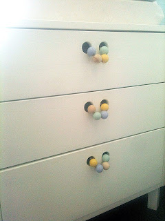 Bland det bästa med att ha vänner som också har småbarn är att man kan låna en massa grejer av varann. Både bra för plånboken och för miljön när alla inte köper nytt. Jag har flera stycken som vi både ärvt kläder av men också byter lite saker med och lånar hit och dit. Innan Sixten föddes lånade vi ett skötbord från våra grannar som inte behövde det just nu. Tror vi är tredje familjen som använder det. Lite vit färg behövde det, och sen fixade jag lite roligare handtag. Träkulor och läderband från Panduro, och lite färg var allt som behövdes till det. Hålen fanns redan så det var bara att knyta dit! Har man en byrå utan hål kan man lätt borra små hål om man vill göra handtag på samma sätt.