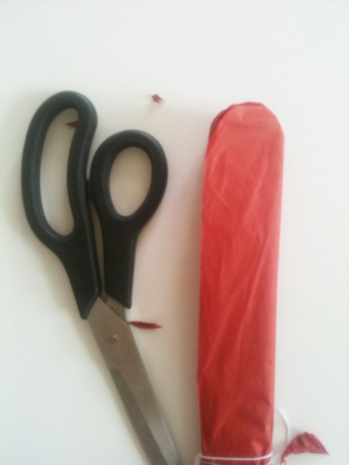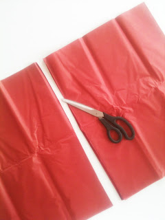 1. Man behöver silkespapper (finns att köpa t.ex HÄR och HÄR.), lite ståltråd, snöre och en bra sax. Jag brukar använda 15 ark papper till antingen en stor pompom eller två mindre.