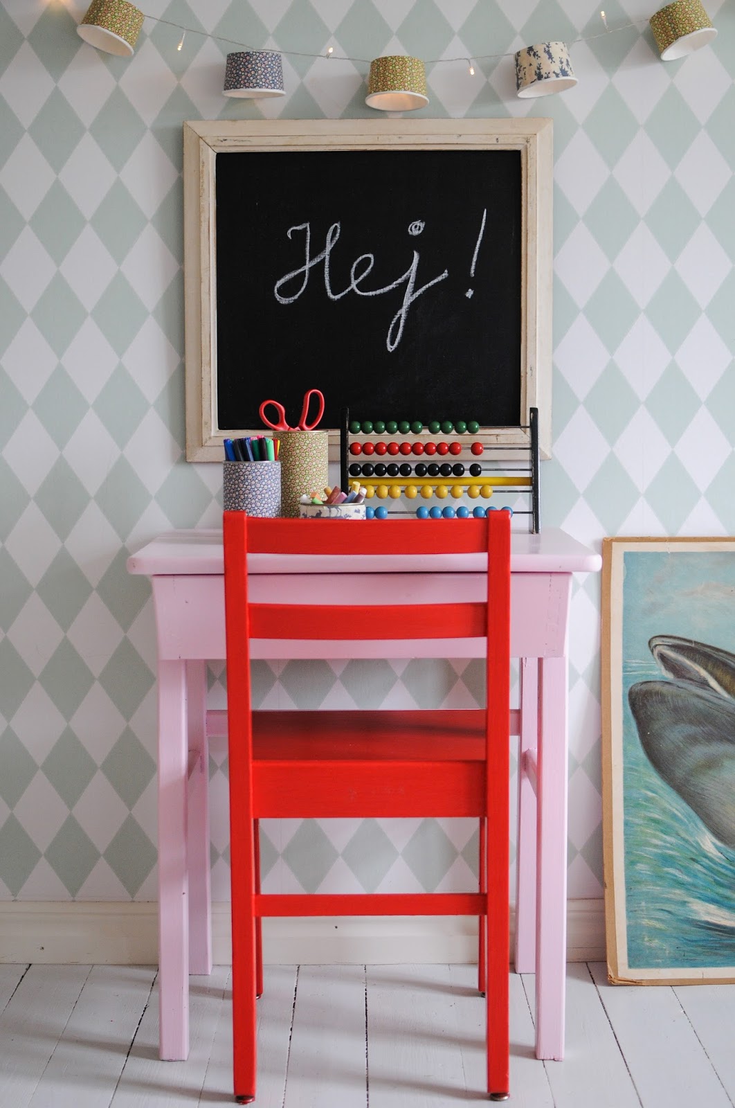 Du kanske kan bli inspirerad av min lilla skrivbordshörna i barnrummet?