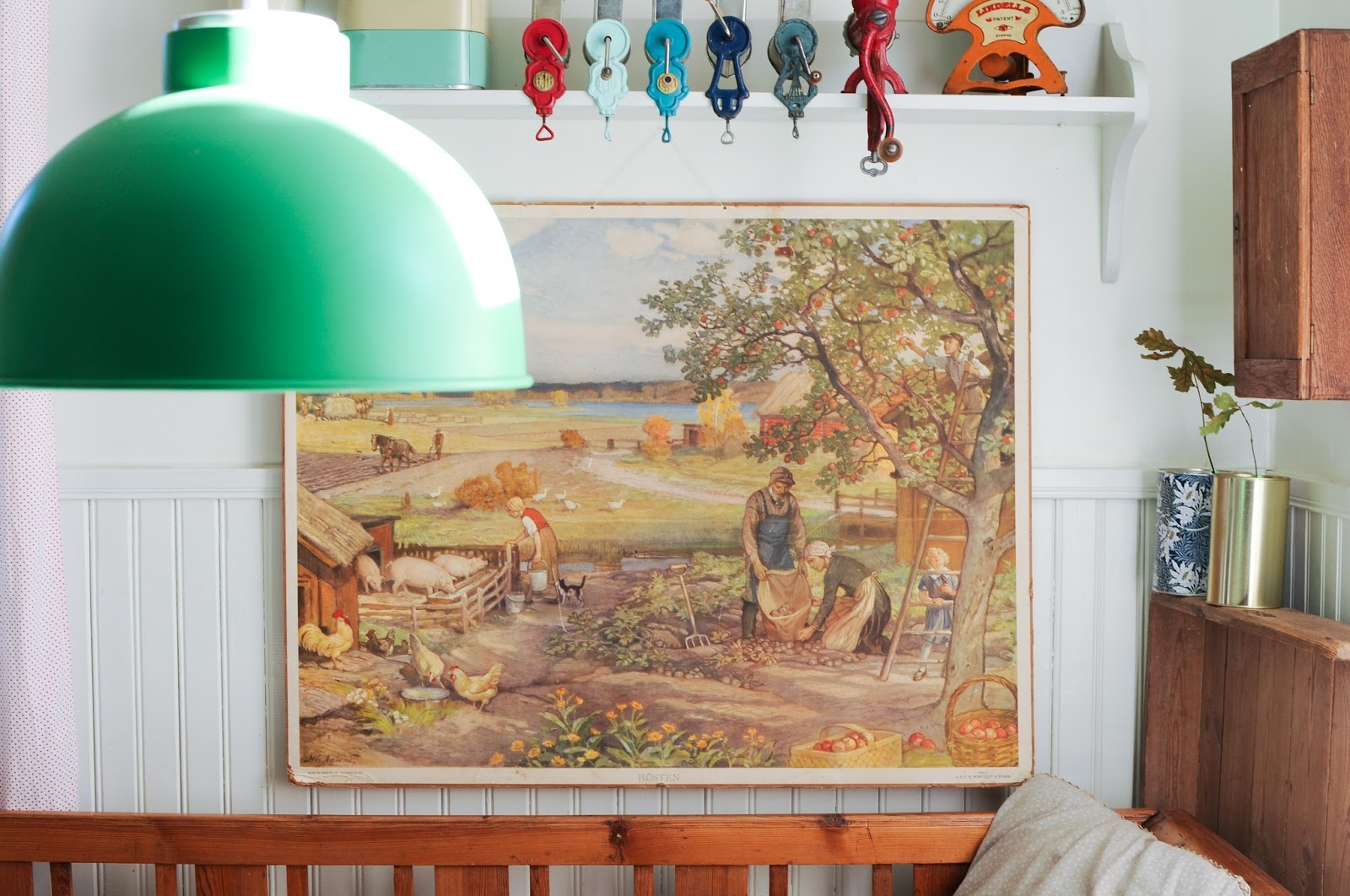 Det säkraste hösttecknet i Kulla är när den här gamla skolplanschen åker fram. Ungefär när skolorna startar brukar jag få höstkänslor och rota fram den . ”Hösten” heter den och är målad av Nils Asplund. Och visst skulle en nästan kunna tro att jag och Jonas börjat försöka efterlikna livet på en sådan här gård lite extra mycket på sistone…