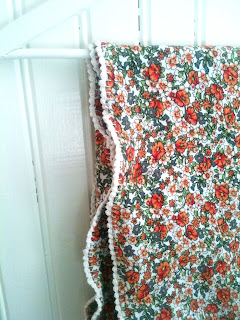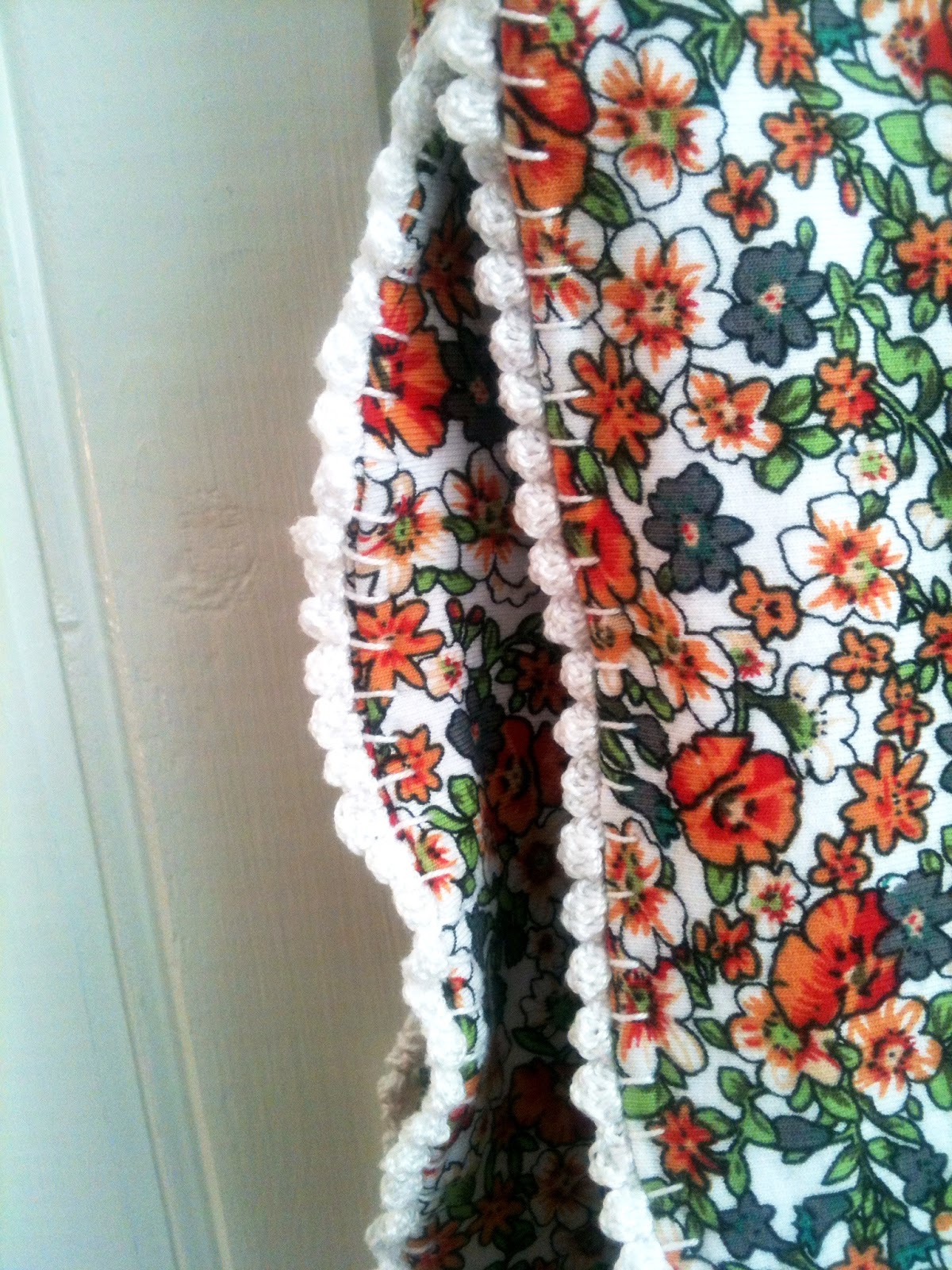 Jag fick lite nya fina tyger i födelsedagspresent av en vän. Bland annat ett småblommigt trikåtyg som kändes väldigt mycket mig. Jag kom på ganska med en gång att det skulle få bli en tubsjal eftersom storleken på tyget passade perfekt. Det mätte ungefär 55×150 så jag behövde inte ens klippa i det. Jag vek det på mitten, rätsida mot rätsida, overlockade långsidan (har man inte overlocksöm så kan man använda vanlig sicksack.), vände tuben åt rätt håll och sydde ihop kortsidorna med overlocksöm där med. Och där skulle det ju egentligen kunnat varit klart men jag bestämde mig för att virka en liten spetskant längs med ena sidan. Då behövde jag ju något att virka i så först sydde jag langettstygn för hand runtomkring i ett halvtunt vitt bomullsgarn( Här finns en beskrivning om någon undrar hur man gör.). Sedan virkade jag i stygnen runt hela sjalen.