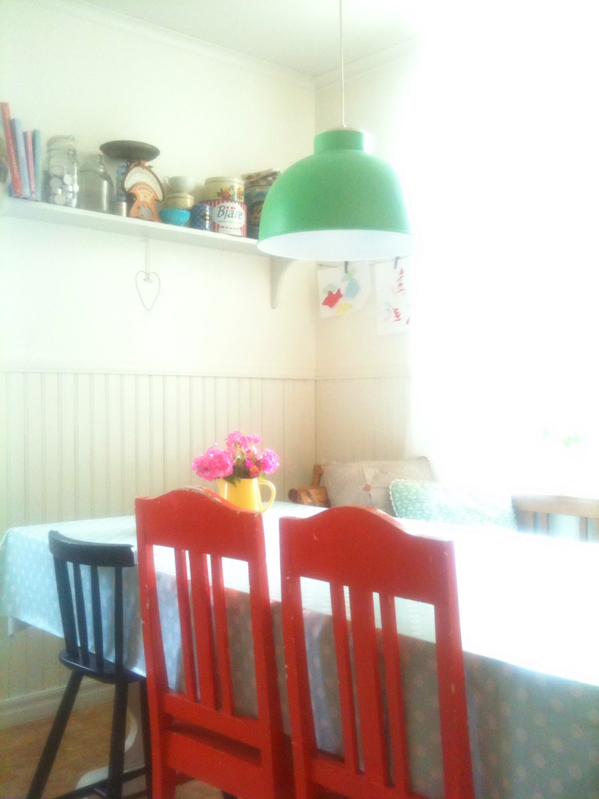 Mitt kök just nu.. Turkos duk, illgrön lampa, orangea stolar. Röd barnstol, gult, blått, mer orange, rosa blommor, prickigt och rutigt. Ska vi köra Köks-underörnensvidavingarkom-leken?