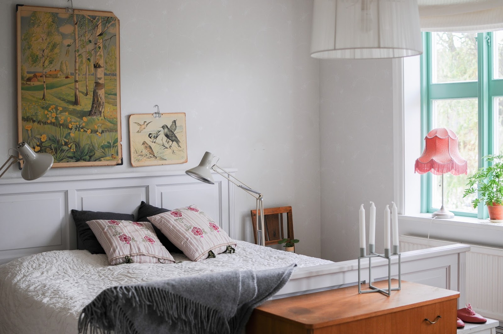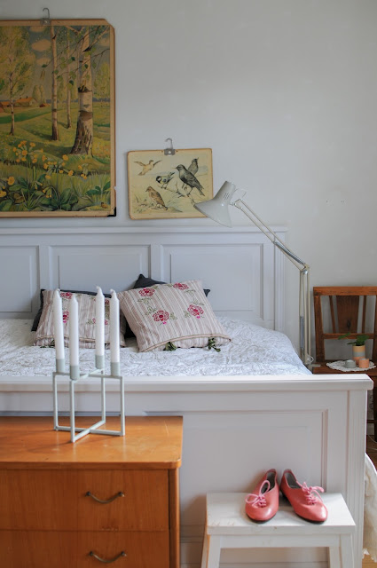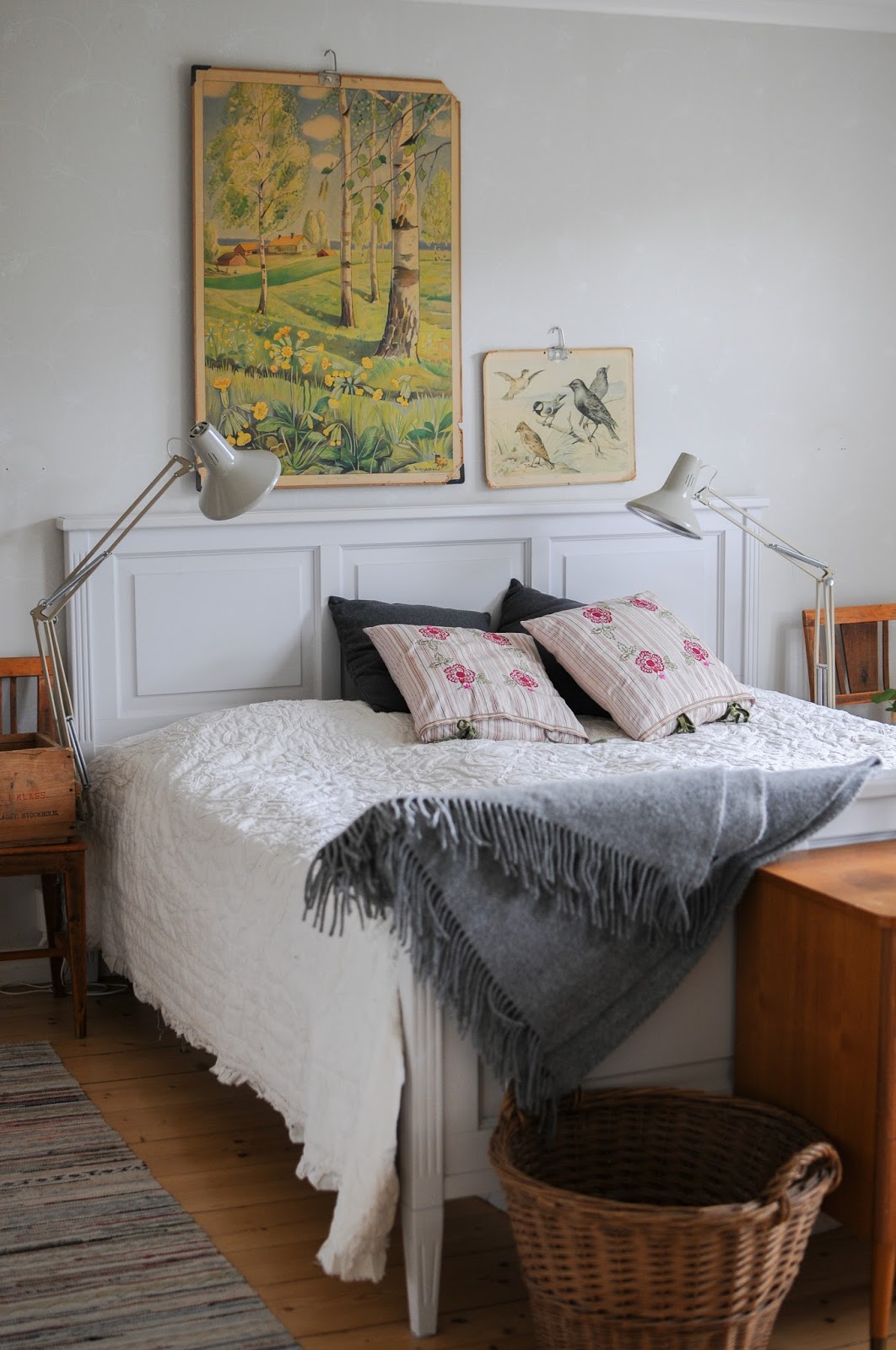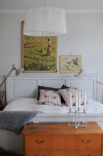 Och förutom överkast, kuddar och pläd så är det inte mycket som inhandlats nytt i det här rummet. Lamporna och skolplanscherna har vi fått, stolarna som vi har som nattduksbord hittade vi på gården.