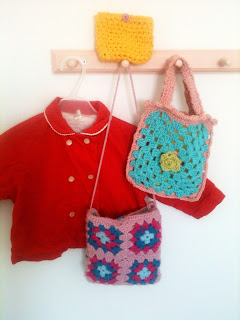 Ofta när jag är pysselsugen och inte riktigt orkar hålla på med något stort projekt utan vill se färdigt resultat på en gång så blir det något litet virkat till barnrummet. Det går superfort, man kan använda små restgarner, och man får stora hurrarop från lilla fröken när det är klart. Små dockkläder går hur fort som helst och det är riktigt roligt att improvisera fram små plagg till nallarna och grodorna och allt vad det är. Av mormorsrutor kan man virka små väskor och portmonnäer eller överkast till docksängen. Någon väska har jag fodrat med blommigt loppistyg och gjort små fack i och en annan är bara som en liten nätkasse utan foder.