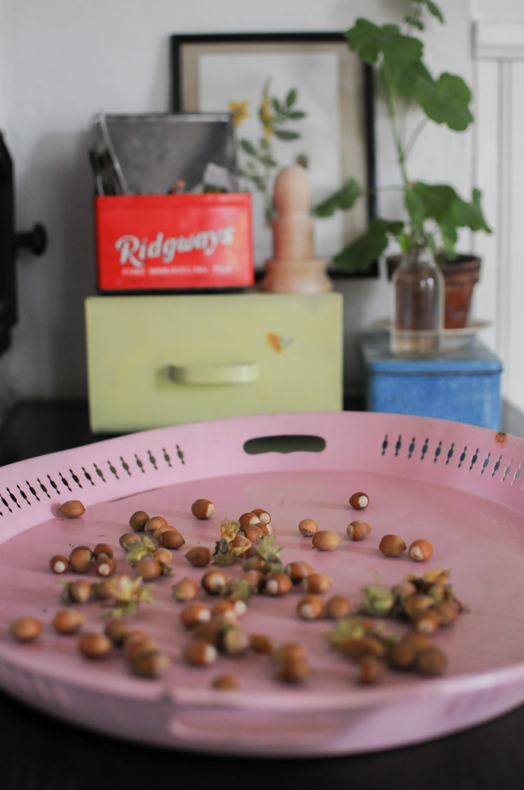 Hasselnötter torkar vi också. Vi har en stor hassel i hagen bakom huset, men det brukar vara så lurigt att skörda nötterna eftersom det verkligen gäller att tajma rätt när de ska plockas. Ofta är de också angripna av en liten insekt som borrat sig in till nöten och ätit upp den. Ofta syns det knappt från utsidan, men i år provade jag att slänga i alla nötter vi plockat i en spann med vatten och kolla vilka som flöt och inte. De som hamnade på botten sparade vi, och de ligger nu på tork. Kanske kan vi åtminstone ha lite hemmaplockade hasselnötter på julafton!